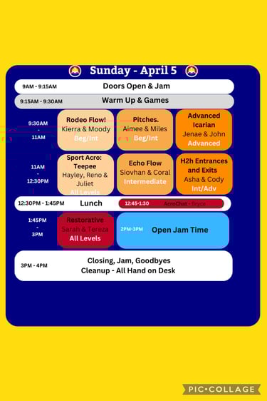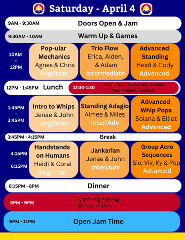 14 hours of acroyoga-focused workshops with a (shorter) evening event on Saturday night. At least 3 classes in each time slot.