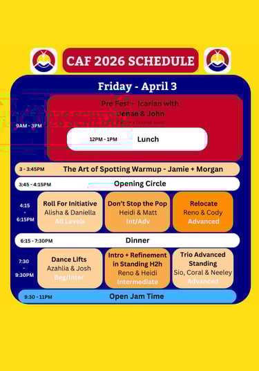 Train for 5 hours at the Pre-Fest! Pre-fest class content has not been finalized, but is guaranteed to include icarian pops, with a high chance of standing skills. Pre-requisites have also not been finalized, but the pre-fest will be intermediate with opportunities for advanced skills.